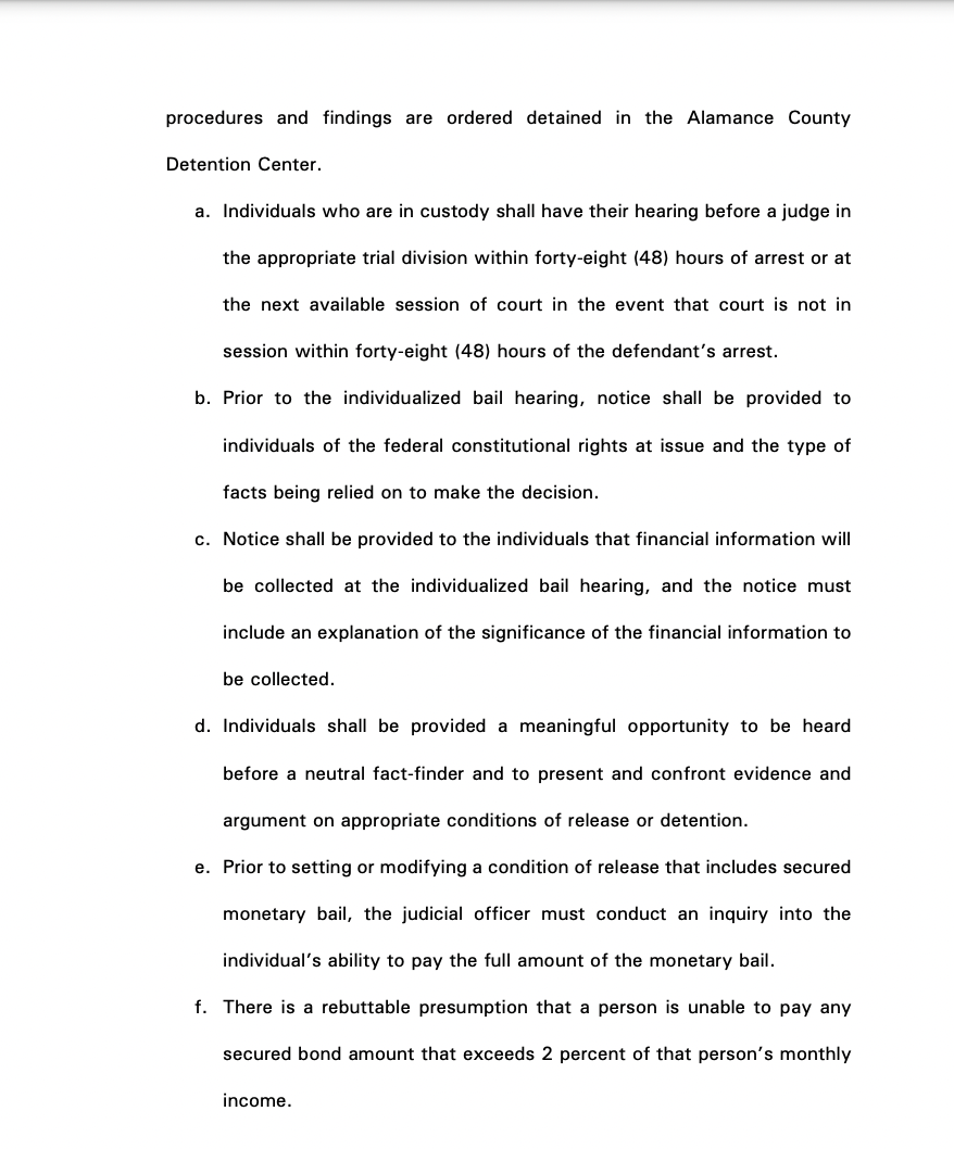 “This is a substantial step forward, particularly considering where Alamance County was, and the practices it was engaging in,” Kang said. “Policies need to be implemented in a way that ensures that people are only being deprived of their fundamental right to pretrial liberty where it is absolutely necessary, and there are no there are no other alternatives.”