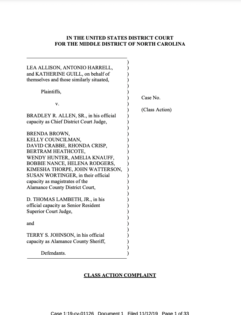 The ACLU, on behalf of multiple plaintiffs, filed a class action complaint against multiple people in power in Alamance County. Among the defendants were the Senior Resident Superior Court Judge, the Chief District Court Judge, all county magistrates and the Sheriff, according to the University of North Carolina School of Government blog on North Carolina criminal law.